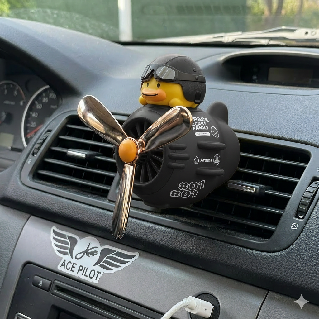 Accessoire de la collection Evelynn. Transformez votre intérieur de voiture en univers plus mignon avec ce diffuseur de parfum en forme de canard version noir déguisé en pilote. Son hélice rotative se met en mouvement naturellement grâce au flux d'air de vos sorties de ventilation. diffusant un parfum frais et durable dans votre voiture. Un accessoire a la fois décoratif et fonctionnel, parfait pour toutes les amatrices de décoration. Expédié depuis l'Espagne, livraison rapide.